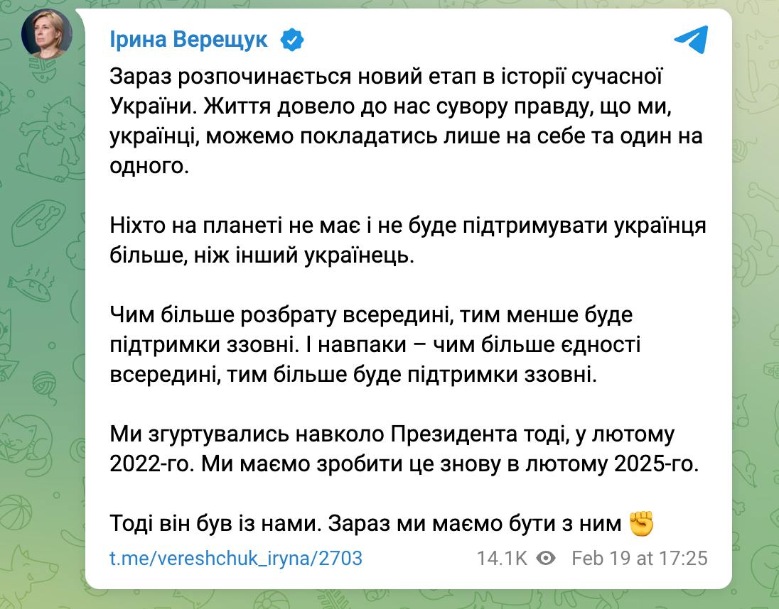 "Мы сплотились вокруг президента тогда, в феврале 2022-го. Мы должны сделать это снова в феврале 2025 года. Тогда он был с нами. Сейчас мы должны быть с ним", - написала чиновница.
