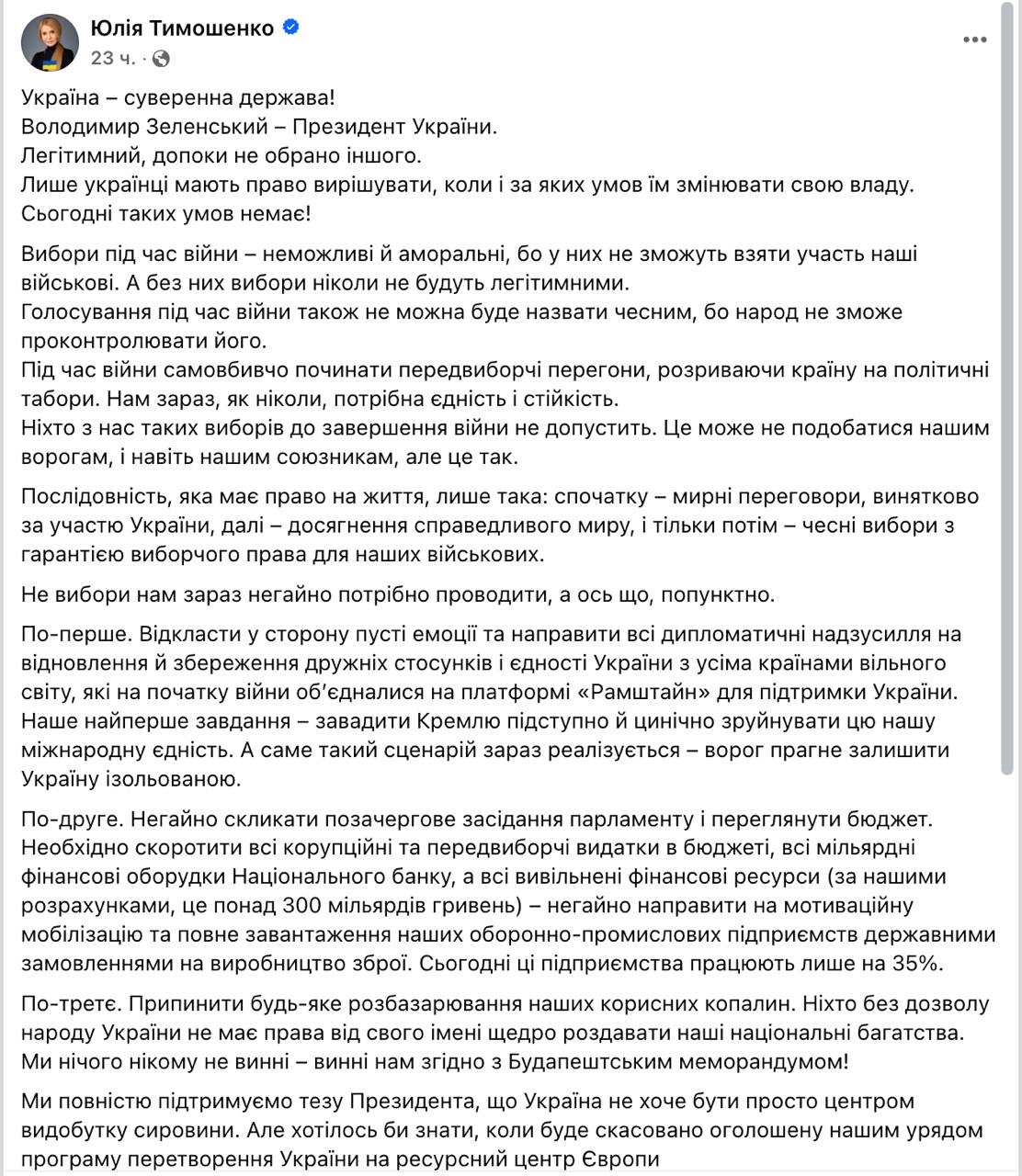 Глава партии "Батькивщина" Юлия Тимошенко заявила, что выборы во время войны "невозможны и аморальны". Она отметила, что без участия в выборах военных голосование не может считаться легитимными.