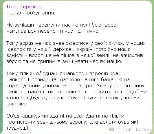 Мэр Харькова Игорь Терехов высказался в аналогичном духе, опубликовав пост о "времени для объединения". По его словам, враг пытается победить политически, не одолев Украину на фронте.