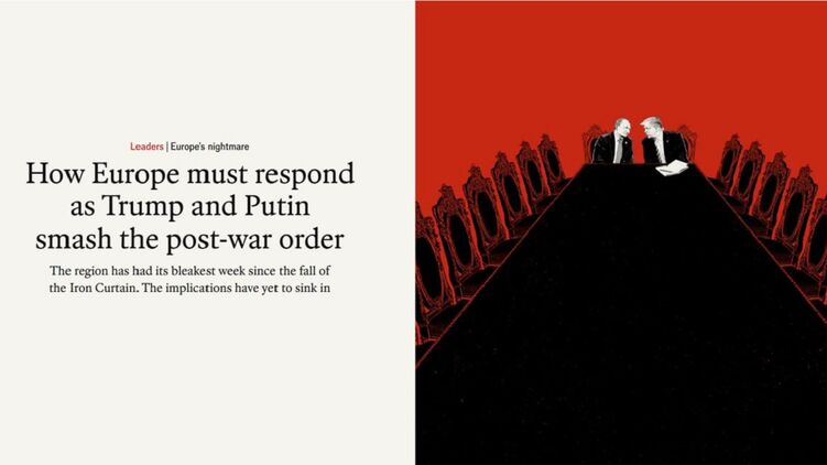 "Прошедшая неделя была самой мрачной в Европе со времен падения "железного занавеса": Украину распродают, Россию реабилитируют, а при Дональде Трампе больше нельзя рассчитывать, что Америка придет на помощь Европе в военное время", - пишет The Economist в редакционной статье "Худший кошмар Европы", вынесенной на обложку номера.