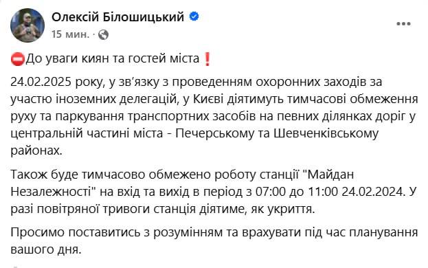 Также будет временно ограничена работа станции "Майдан Незалежности" на вход и выход в период с 07:00 до 11:00 24.02.2024.