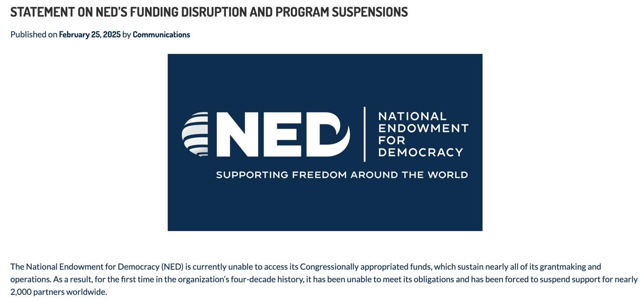 По заявлению фонда, деньги не должны были попасть под указ Государственного департамента о заморозке на 90 дней, так как NED, в отличие от USAID, является частным фондом. Хотя несмотря на это 95% финансирования он получал от Конгресса.