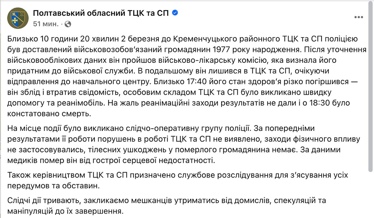 11.36 В Кременчугском ТЦК умер мобилизованный вскоре после прохождения ВВК, сообщает Полтавский военкомат.
