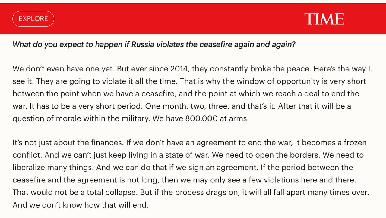 "Окно возможностей очень короткое между моментом, когда у нас будет прекращение огня, и моментом, когда мы достигнем соглашения о прекращении войны. Это должен быть очень короткий период. Месяц, два, три, и все. После этого это будет вопрос морального духа в армии. У нас под ружьем 800 000 человек", - сказал украинский президент.