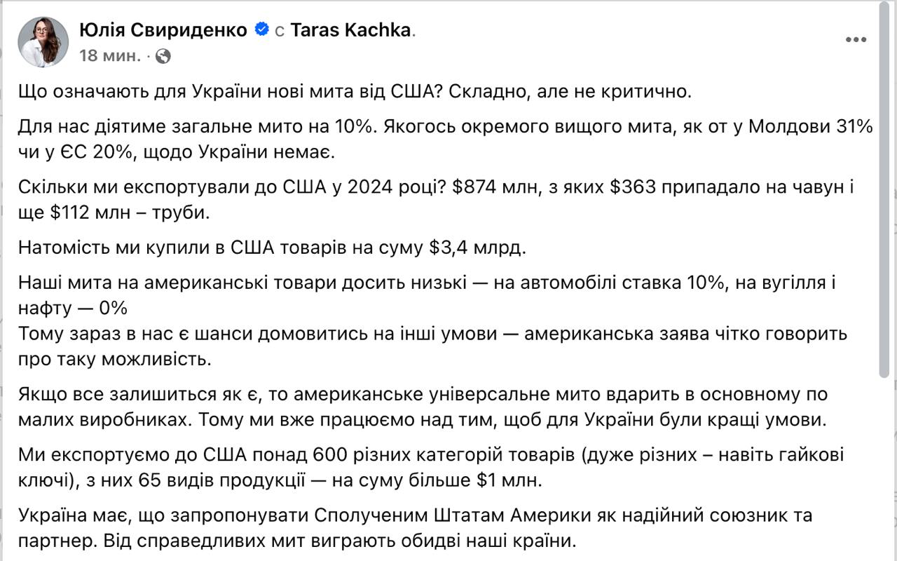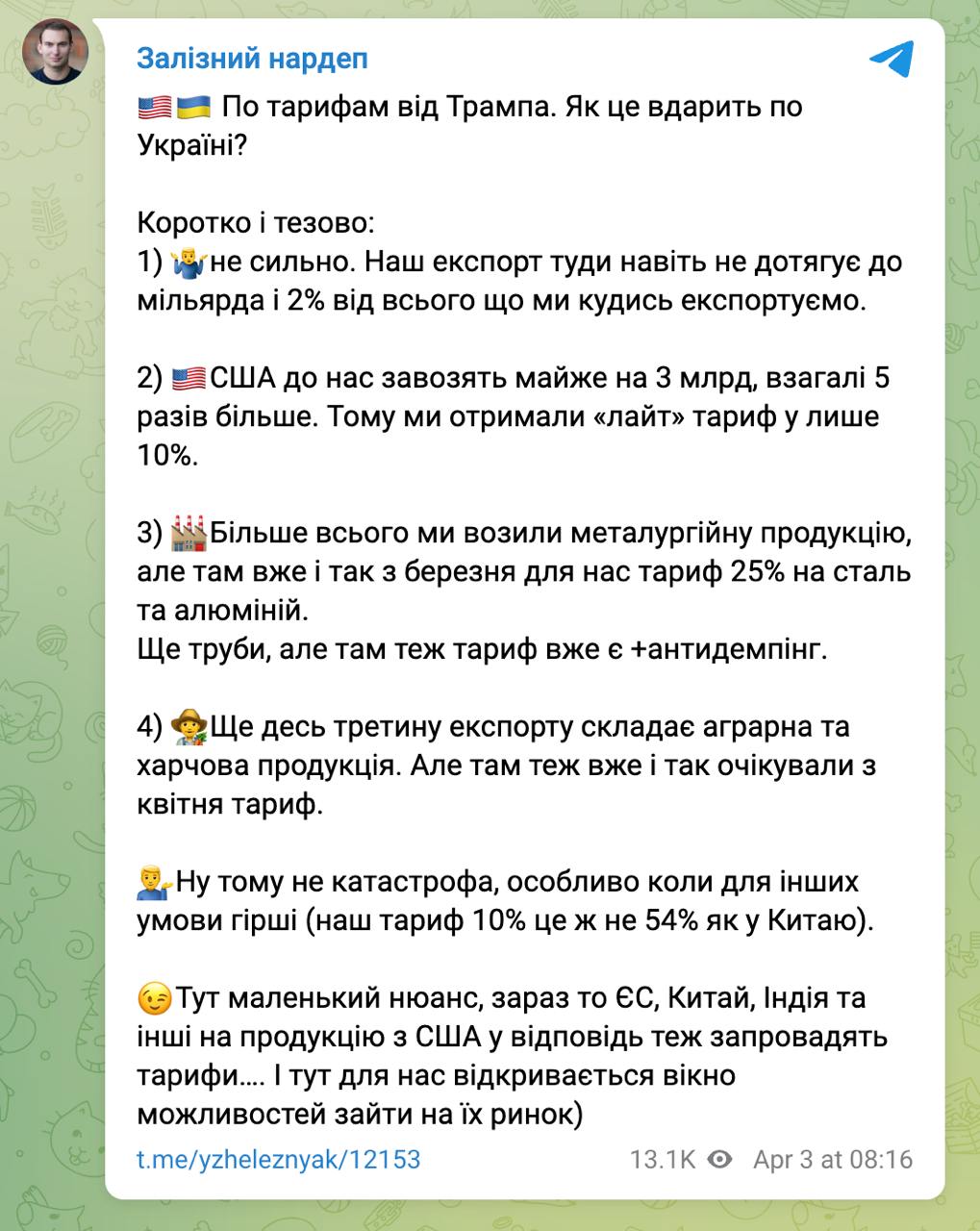 "Наш экспорт туда (в США - Ред.) даже не дотягивает до миллиарда и 2% от всего, что мы куда-то экспортируем. США к нам завозят почти на 3 млрд, вообще 5 раз больше. Поэтому мы получили "лайт" тариф всего в 10%. Больше всего мы ввозили металлургическую продукцию, но там уже и так с марта для нас тариф 25% на сталь и алюминий. Еще трубы, но там тоже тариф уже есть антидемпинг", - пишет Железняк.