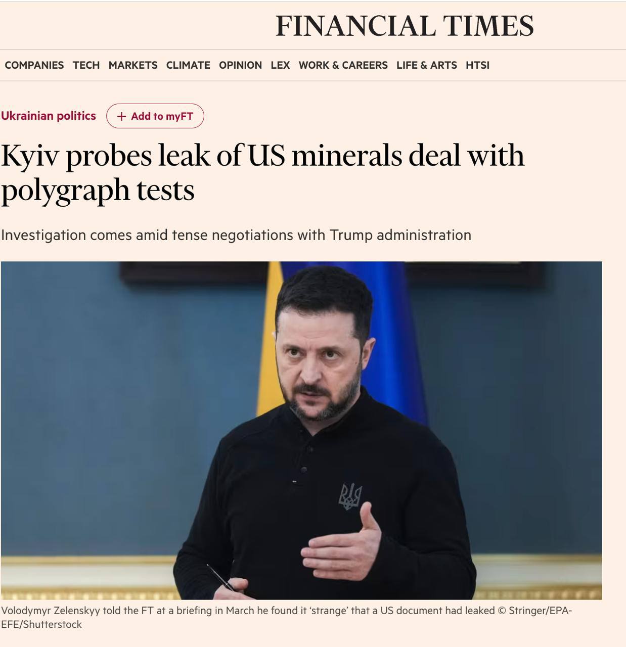 Теперь, по версии издания, Зеленский поручил расследовать утечку последнего предложения США, пропустив чиновников Кабмина через полиграф. Украинские чиновники уверяют, что были застигнуты врасплох масштабами последних требований США и считают политически несостоятельными некоторые части предложения Вашингтона по извлечению прибыли из инфраструктуры их страны.