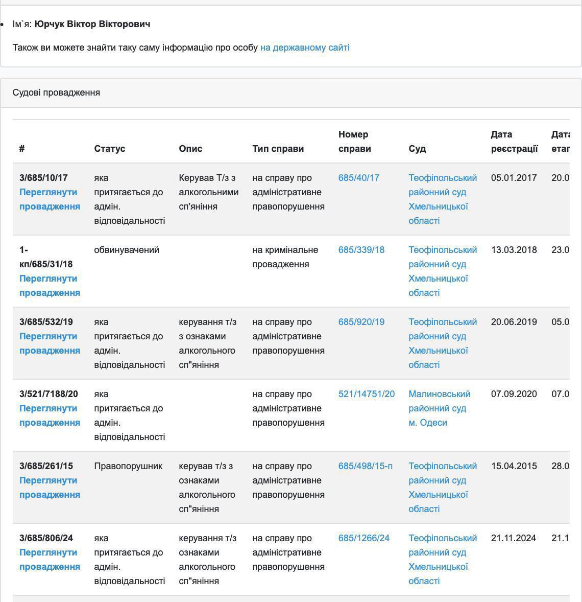 После этого заявления телеграм-каналы  нашли в судебном реестре семь разбирательств в отношении Юрчука за езду за рулем в состоянии алкогольного опьянения. Первое дело было зарегистрировано еще в 2015 году, а последнее - в январе этого года.