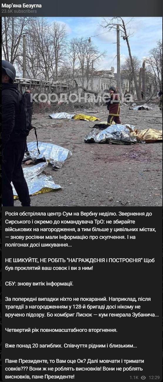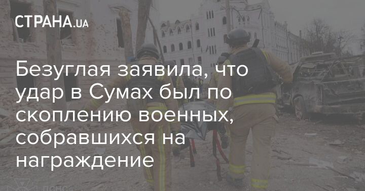 Народный депутат Марьяна Безуглая пишет, что прилет в Сумах был по скоплению военных, которые проводили торжественное награждение.