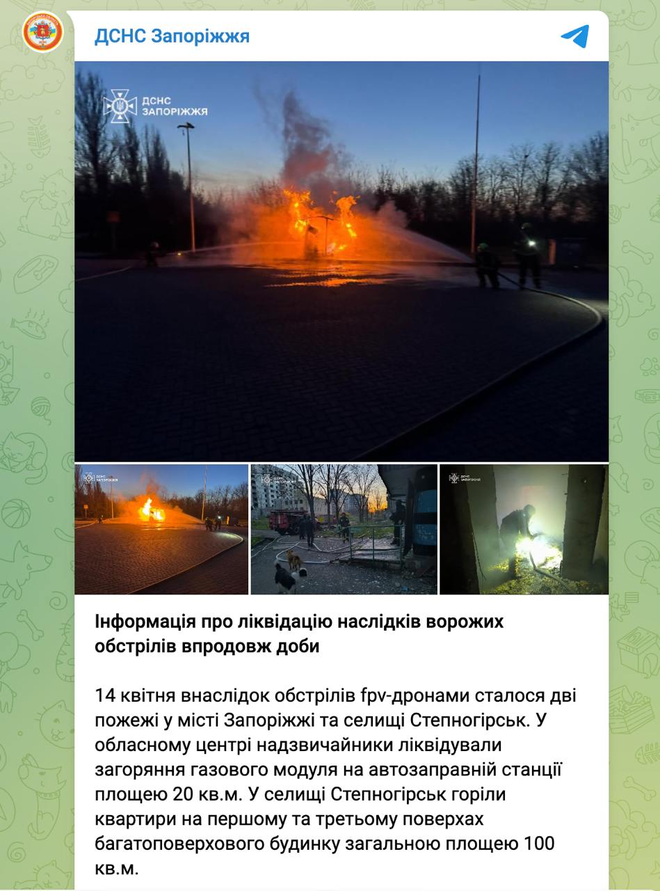 Он атаковал заправку, загорелся газовый модуль, сообщает ГСЧС.