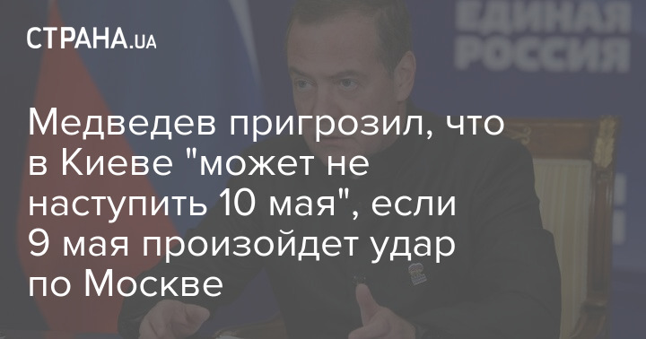 Заместитель председателя Совета безопасности РФ Дмитрий Медведев пригрозил, что в Киеве "может не наступить 10 мая", если 9 мая произойдет удар по Москве.