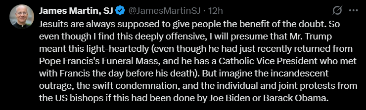 "Как иезуит, я стараюсь давать людям шанс. Хотя изображение крайне оскорбительно, я предположу, что Трамп имел в виду это как шутку - несмотря на то, что он только что вернулся с похорон Папы Франциска, а его католический вице-президент встречался с Франциском накануне его смерти".