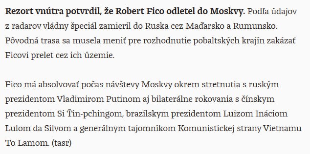 Как написал новостной портал Dennik N, его самолет летел в Москву по длинному южному маршруту, проходящему через Венгрию, Румынию, Черное море и Грузию. Маршрут изменили после того, как в среду самолету главе словацкого правительства запретили пролетать над своей территорией Эстония, Латвия и Литва.