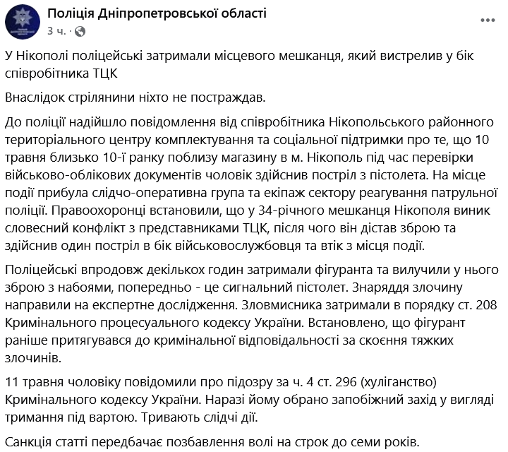 В Никополе Днепропетровской области мужчина открыл огонь по сотруднику ТЦК во время проверки документов, после чего скрылся.