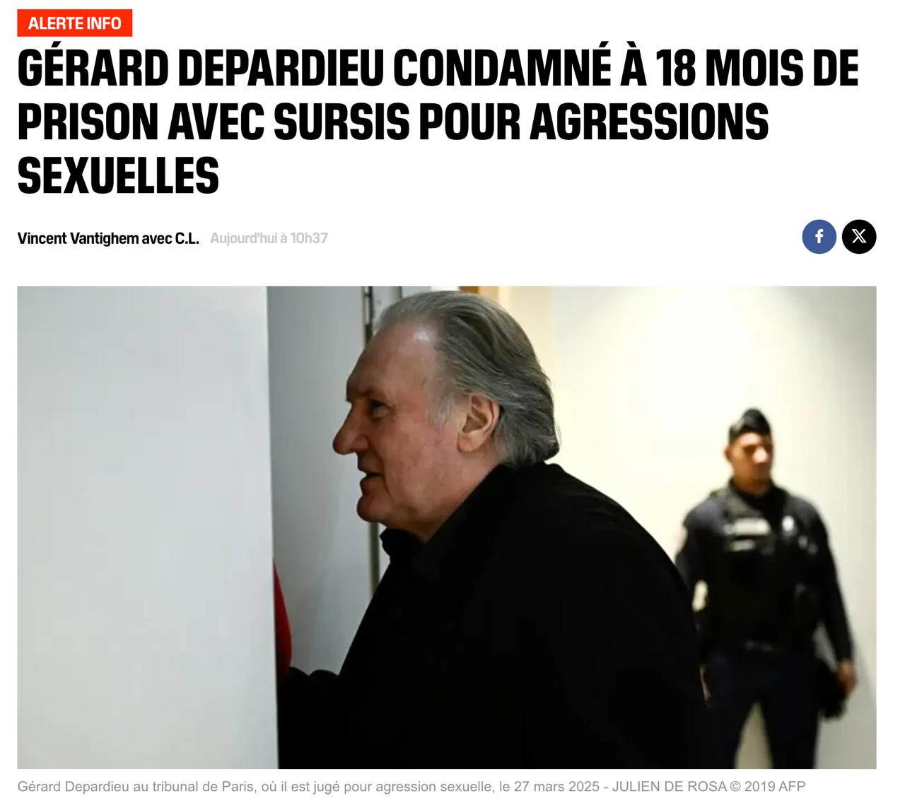 Парижский суд признал 76-летнего французского актера Жерара Депардье виновным по делу о домогательствах на съемках фильма "Зеленые облака" в 2021 году. Звезду приговорили к 18 месяцам лишения свободы условно.