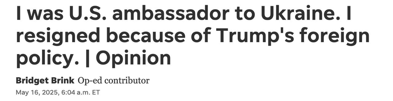 "Политика администрации Трампа с самого начала заключалась в оказании давления на жертву, Украину, а не на агрессора, Россию. Таким образом, я больше не могла добросовестно проводить политику администрации и сочла своим долгом уйти в отставку", - написала Бринк.