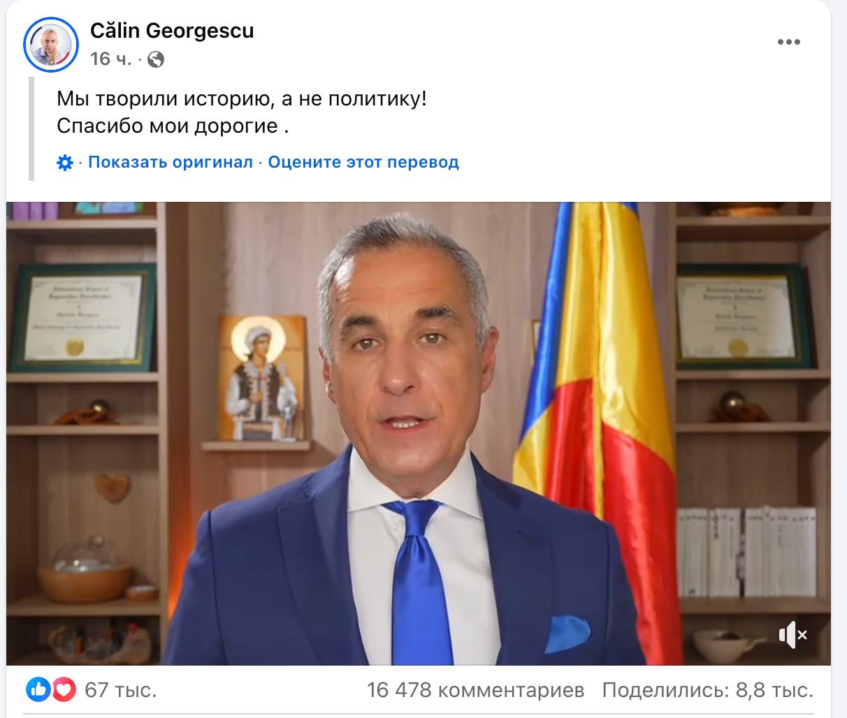 Напомним, Джорджеску победил в первом туре президентских выборов, однако результаты голосования отменили из-за якобы вмешательства России, которое так и не было доказано.