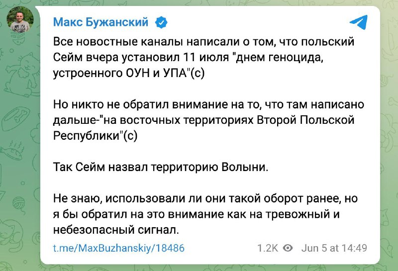 А народный депутат Максим Бужанский считает "тревожным и небезопасным сигналом", что Польша назвала украинскую Волынь "восточными территориями Второй Польской Республики".