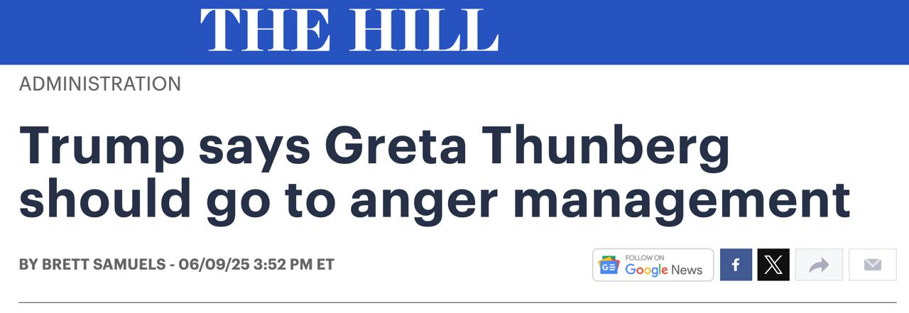 "Она странный человек. Она молодая, злая. Она определенно необычная. Я думаю, ей нужно посещать курсы по управлению гневом. Это моя главная рекомендация для нее", - заявил глава Белого дома на просьбу журналистов прокомментировать задержание судна с активисткой у берегов Газы.