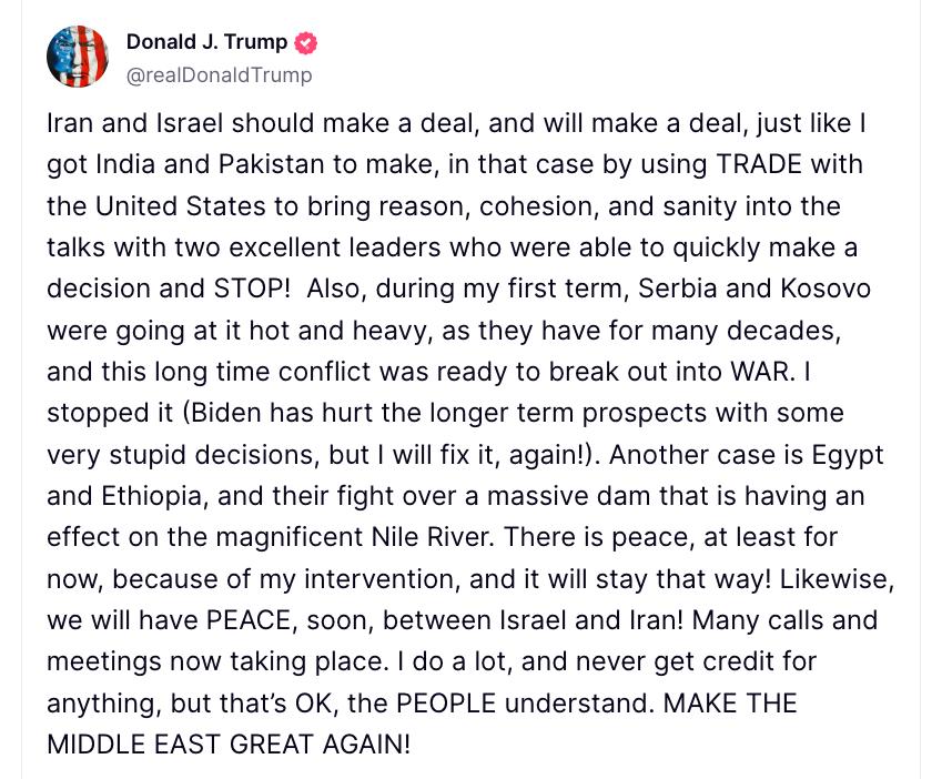 "США не имели никакого отношения к сегодняшнему нападению на Иран. Если Иран каким-либо образом или в какой-либо форме нападет на нас, вся сила и мощь вооруженных сил США обрушатся на вас на уровнях, которых никогда не было. Однако мы можем легко заключить сделку между Ираном и Израилем и положить конец этому кровавому конфликту", - написал президент США.