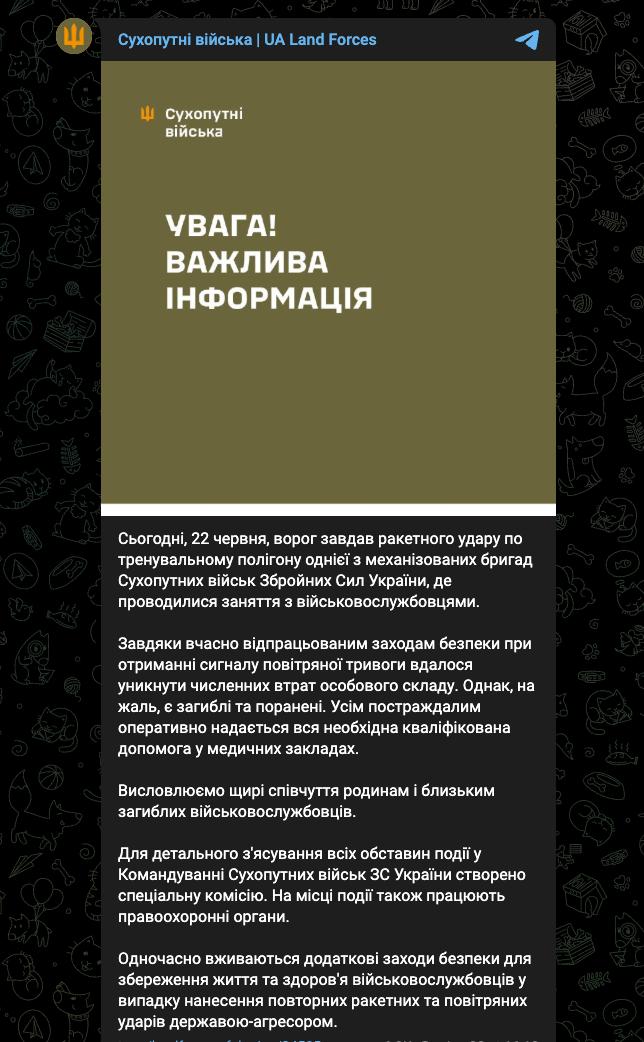 Между тем российские военные паблики показали видео удара по украинскому полигону, о котором сообщали Сухопутные войска ВСУ. Они утверждают, что погибли около 70 военных.