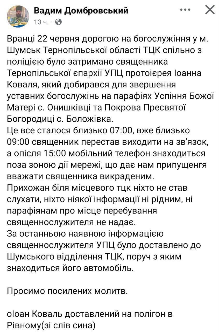 "Утром 22 июня по дороге на богослужение в г. Шумск Тернопольской области ТЦК совместно с полицией был задержан священник Тернопольской епархии УПЦ протоиерей Иоанн Коваль, который добирался для совершения уставных богослужений на приходах Успения богородицы. Это все произошло около 07:00, уже около 09:00 священник перестал выходить на связь, а с 15:00 мобильный телефон находится вне зоны действия сети, что дает нам предположение считать священника похищенным. Прихожан возле местного ТЦК никто не стал слушать, никто никакой информации ни родным, ни прихожанам о местонахождении священнослужителя не предоставляет. По последней имеющейся информации, священнослужитель УПЦ был доставлен в Шумское отделение ТЦК, рядом с которым находится его автомобиль", - говорится в сообщении.