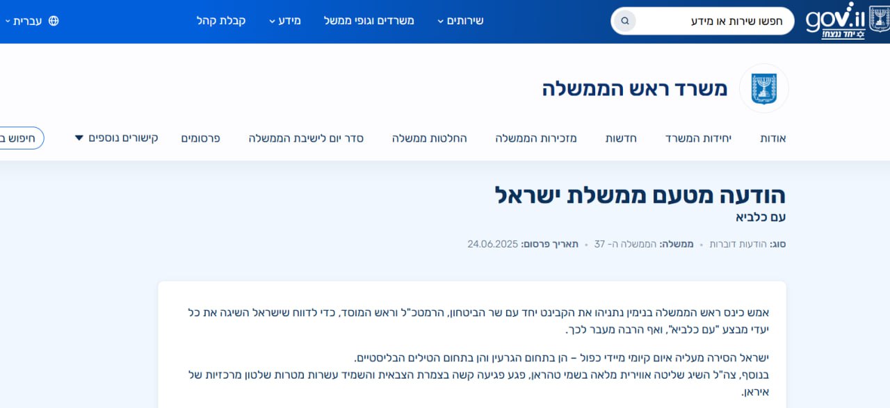 Об этом говорится на сайте израильского правительства.