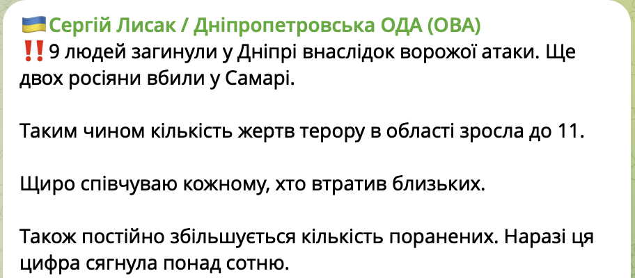 "9 человек погибли в Днепре в результате вражеской атаки. Еще двоих россияне убили в Самаре. Таким образом, количество жертв террора в области возросло до 11", - написал он.