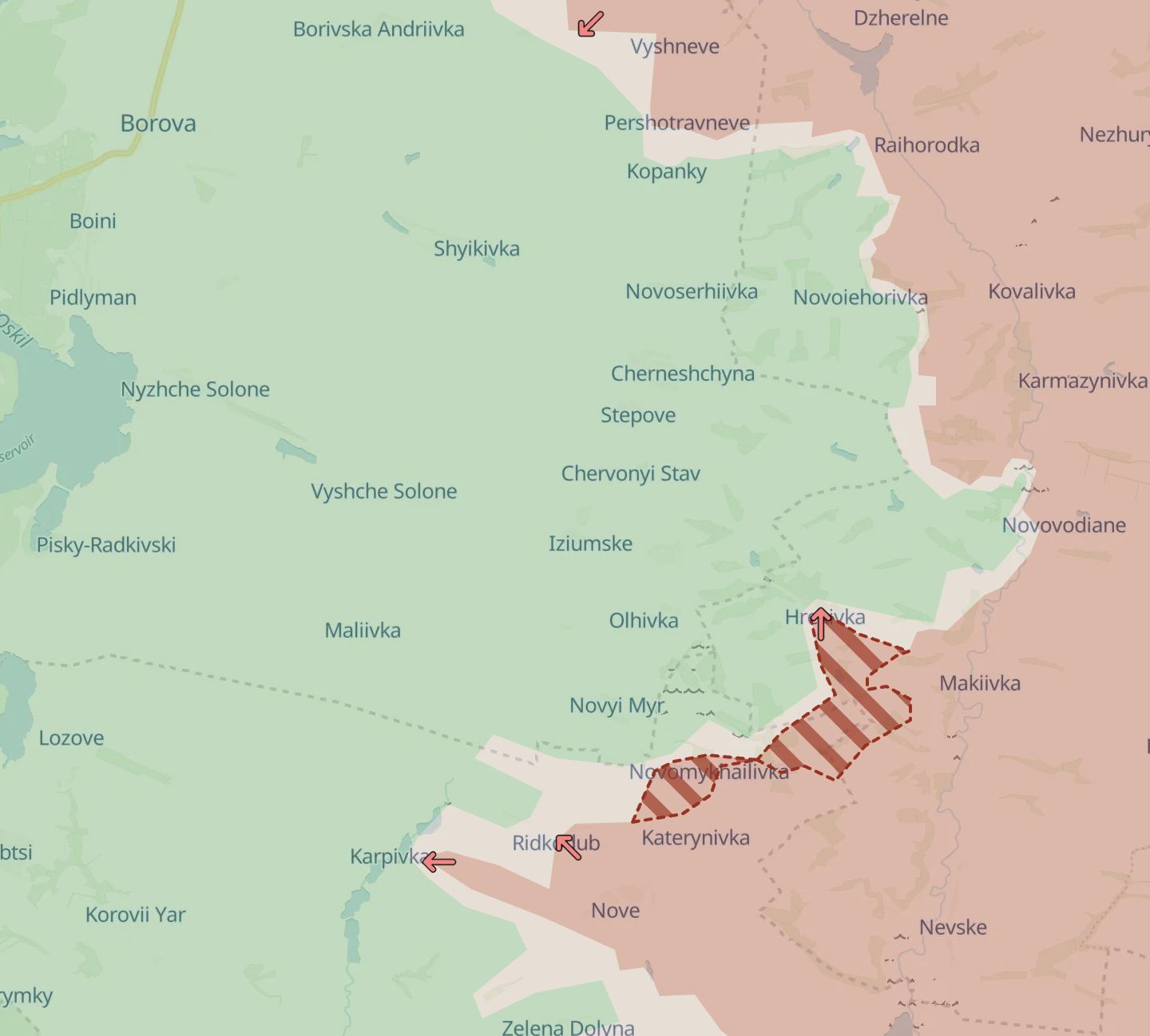 Также россияне продвинулись в районе Боровой - по линии Новомихайловки (захвачена) и Грековки. Это почти 9-километровый по длине участок фронта.