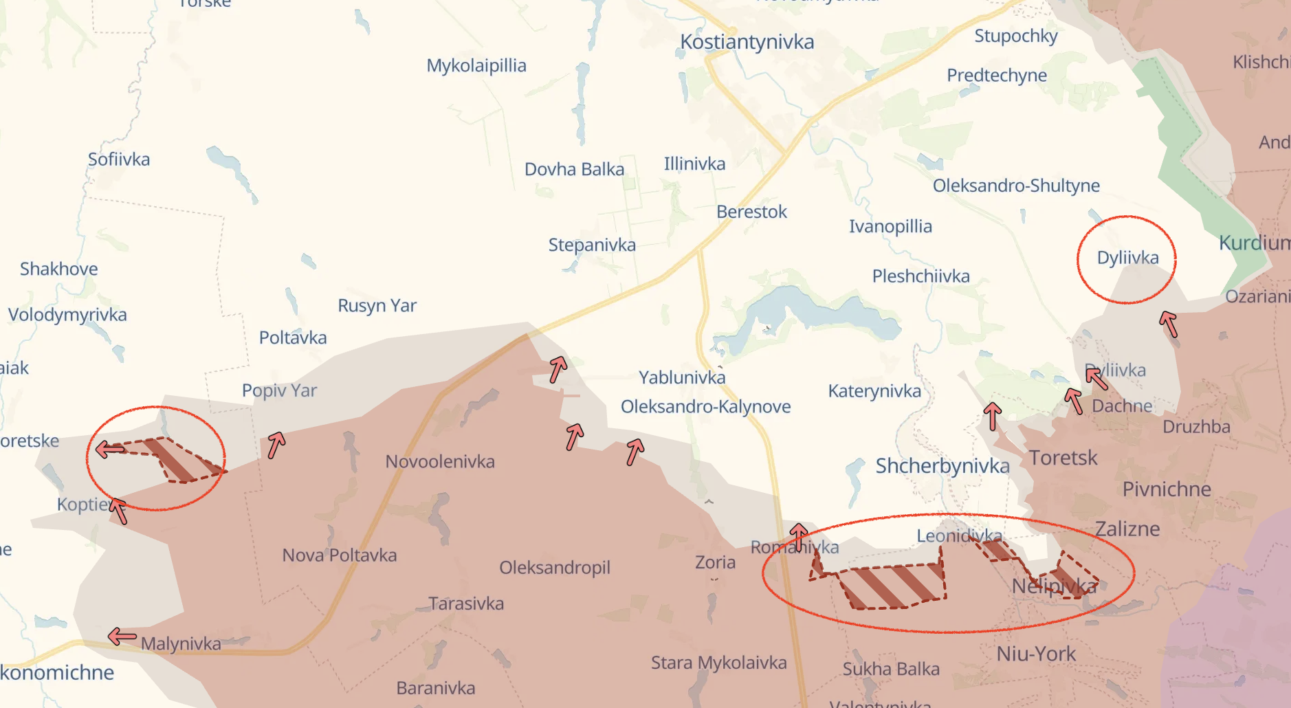 Российское минобороны при этом заявило о захвате Дылеевки к северу от Торецка. Украина этого не подтверждала, по карте Deep State село находится в серой зоне.