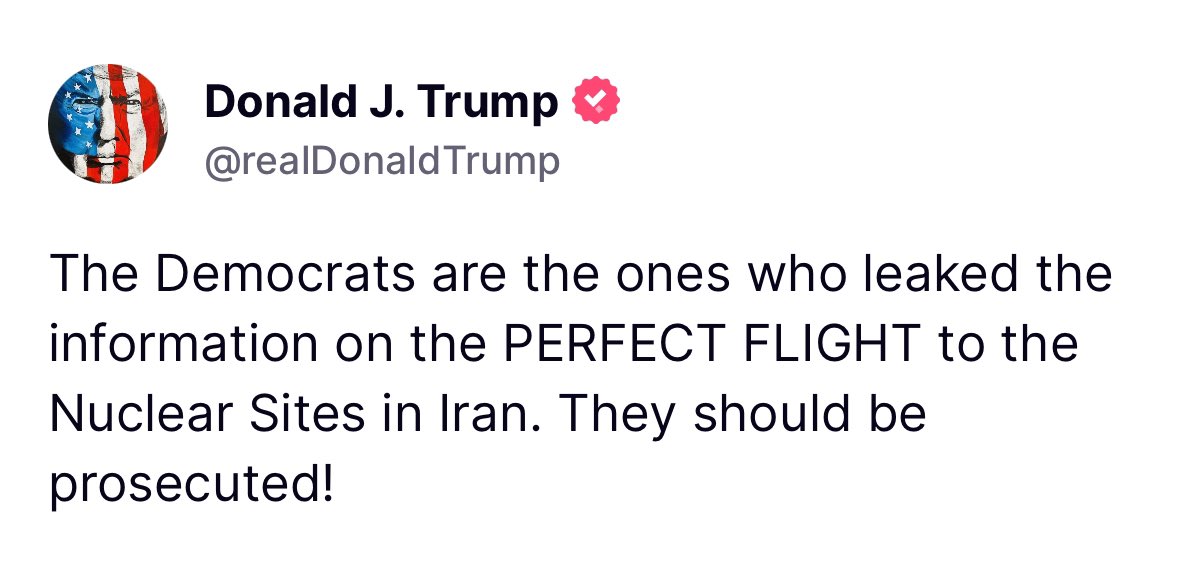 "Это демократы слили информацию об идеальном полёте к ядерным объектам Ирана. Они должны быть привлечены к ответственности!" – написал он в Truth.