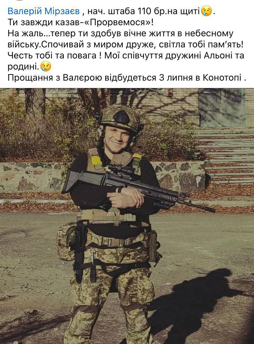 17.55 При ударе во вторник по командному пункту погиб не только командир 110-й бригады, но также его заместитель Дмитрий Романюк и начальник штаба бригады Валерий Мирзаев. О гибели Романюка сообщает военный и экс-нардеп Егор Фирсов, а о смерти Мирзаева говорится на его странице в соцсетях.