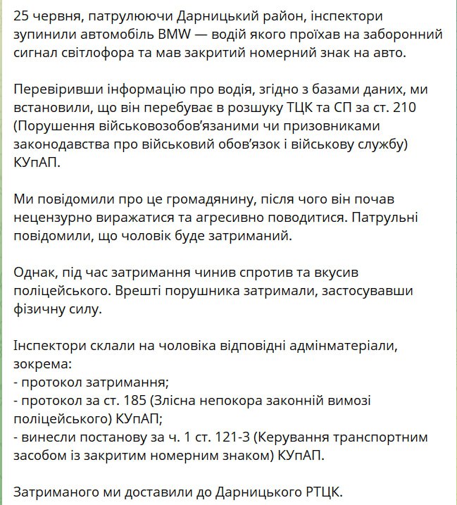 Позже патрульная полиция Киева сообщила, что мужчину, укусившего полицейского, отправили в ТЦК.