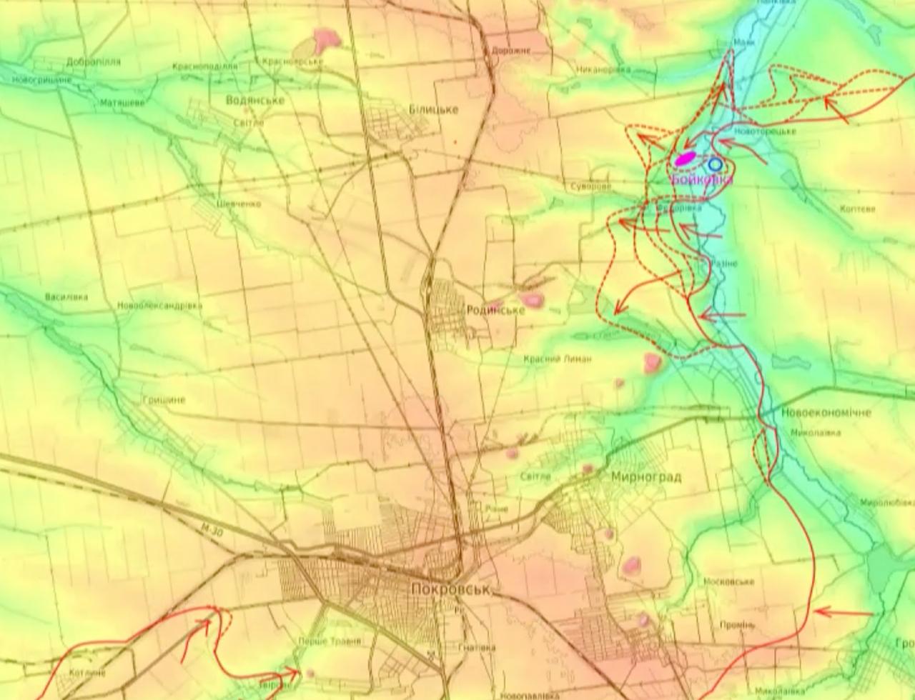 Очевидный замысел российского командования на этом направлении - выход к северу от Покровска, что помещает обороняющиеся там части ВСУ в большой "карман", где будут простреливаться все логистические маршруты украинской армии. Что резко усложнит оборону этого участка.