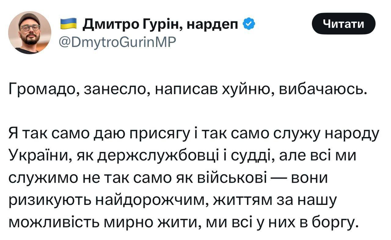 Однако после резонанса в соцсетях Гурин решил внести ясность в свое заявление. Он извинился и написал, что его "занесло, написал х@йню".