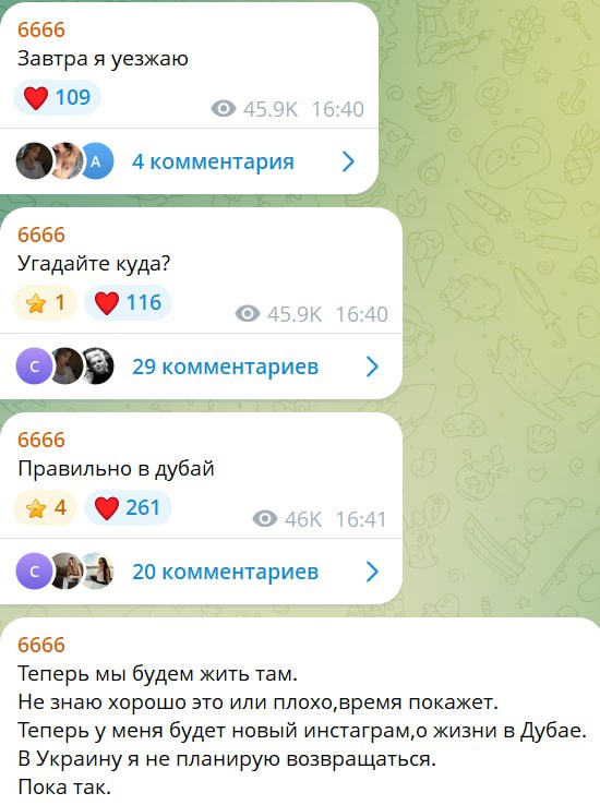 "Завтра я уезжаю. Угадайте, куда. Правильно, в Дубай. Теперь мы будем жить там. Не знаю, хорошо это или плохо, время покажет. Теперь у меня будет новый Инстаграм, о жизни в Дубае. В Украину я не планирую возвращаться. Пока так", - сказано в публикациях.