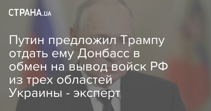 Российский лидер Владимир Путин предлагает президенту США Дональду Трампу отвод ВСУ из Донбасса в обмен на выход российских войск из трех областей Украины - Сумской, Харьковской и Днепропетровской.