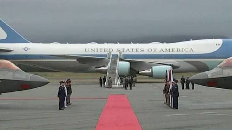Встречающие в аэропорту Анкориджа американцы расстелили главе Белого дома красную дорожку.