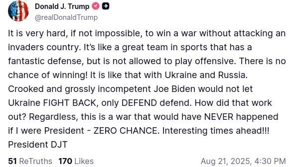 "Очень сложно, если не невозможно, выиграть войну, не нападая на страну-захватчика. Это как отличная спортивная команда, у которой фантастическая оборона, но которой запрещено играть в нападении. Шансов на победу нет! То же самое с Украиной и Россией. Лживый и совершенно некомпетентный Джо Байден не позволил Украине ответить, только защищаться. И что из этого получилось? Как бы то ни было, эта война никогда бы не началась, будь я президентом - никаких шансов. Впереди интересное время", - написал президент США.