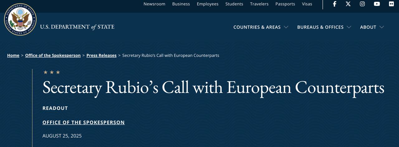 Госсекретарь США Марко Рубио и главы МИД стран Европы "договорились продолжить сотрудничество в дипломатических усилиях по прекращению войны между Россией и Украиной путем достижения прочного урегулирования на основе переговоров".