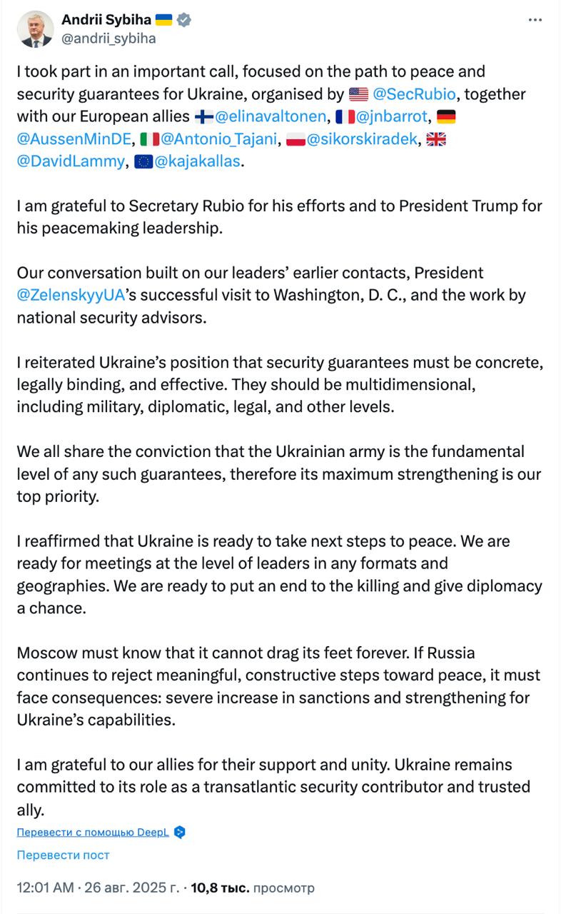 В свою очередь глава МИД Украины Андрей Сибига подтвердил, что с Рубио и европейцами по телефону обсуждались гарантии безопасности для Украины.