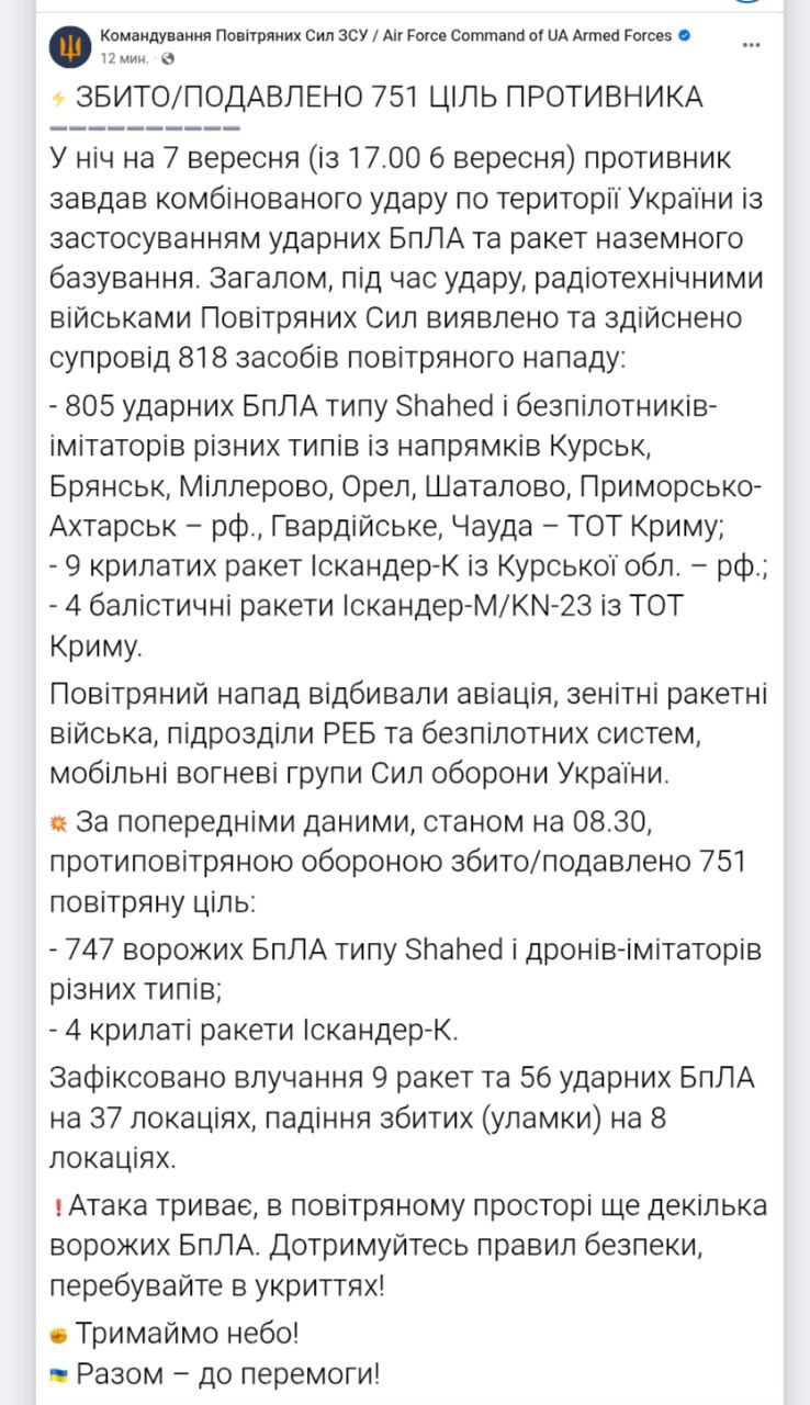 По состоянию на 08.30 ПВО сбито/разбито 751 воздушная цель: