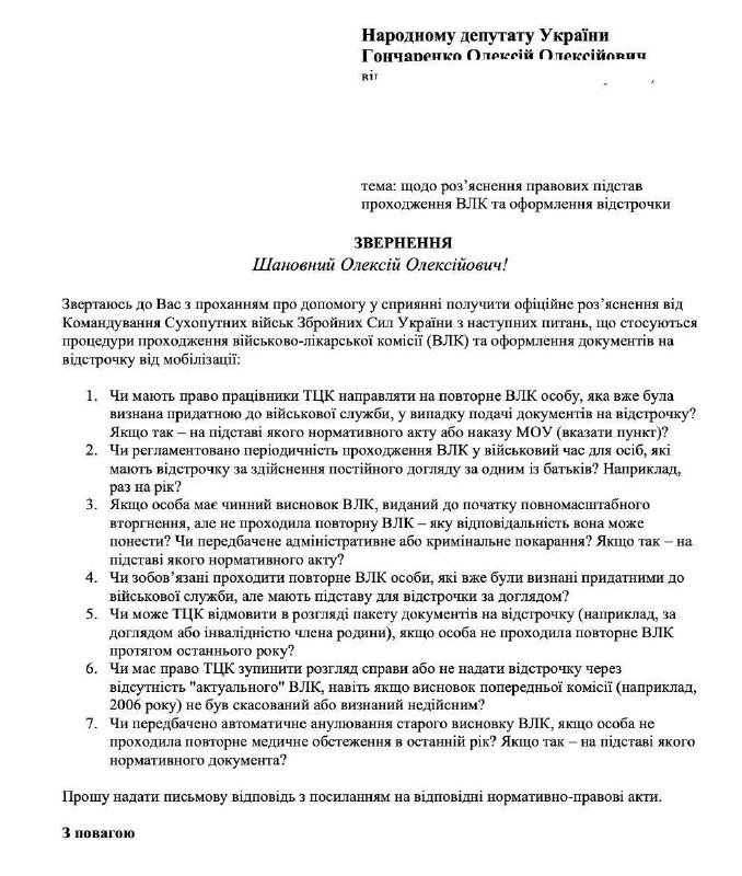"Главное из этого ответа: если уже признали пригодным без ограничений, проходить ВВК ежегодно не нужно. Старая ВВК не аннулируется автоматически. Отказать в отсрочке из-за несвежих результатов ВВК не имеют права. Ответственности за непрохождение ВВК раз в год законом нет. Повторно направляют на ВВК только тех, кого сочли ограниченно или временно непригодными. Вывод прост: требования ТЦК делать новую ВВК каждый год – это злоупотребление. Закон этого не требует", - написал Гончаренко в своем телеграм-канале.