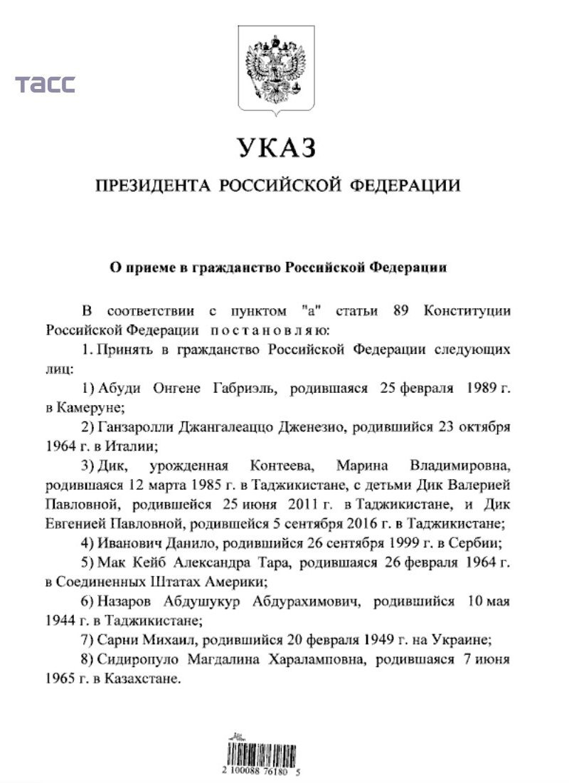 "Принять в гражданство России <...> Мак Кейб Александра Тара, родившуюся 26 февраля 1964 года в Соединенных Штатах Америки", - говорится в документе.
