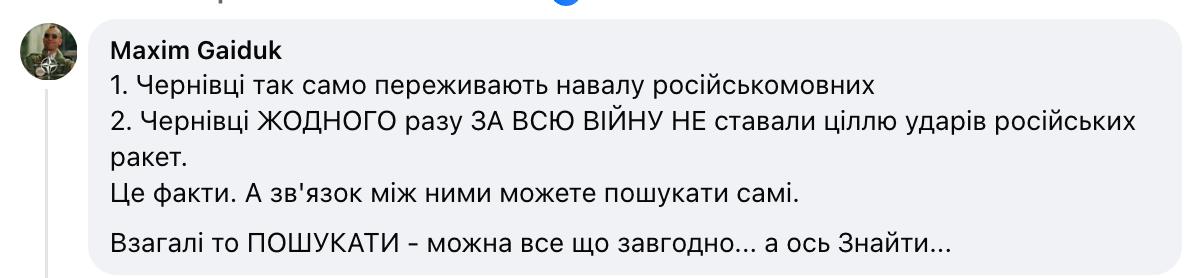 "Сумы стали целью ударов российских ракет. Чернигов стал целью ударов российских ракет. Кременчуг стал целью ударов российских ракет. Запорожье стало целью ударов российских ракет. Киев стал целью ударов российских ракет. Харьков стал целью ударов российских ракет. Капранов долбо@б. Это факты. А связи между ними можете поискать сами", - передразнил умозаключения писателя эксперт по ЖКХ и энергетике Олег Попенко.