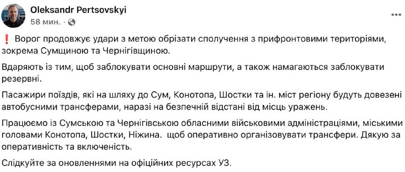 "Враг продолжает удары с целью обрезать сообщение с прифронтовыми территориями, в частности, Сумщиной и Черниговщиной. Ударяют, чтобы заблокировать основные маршруты, а также пытаются заблокировать резервные", - считает Перцовский.