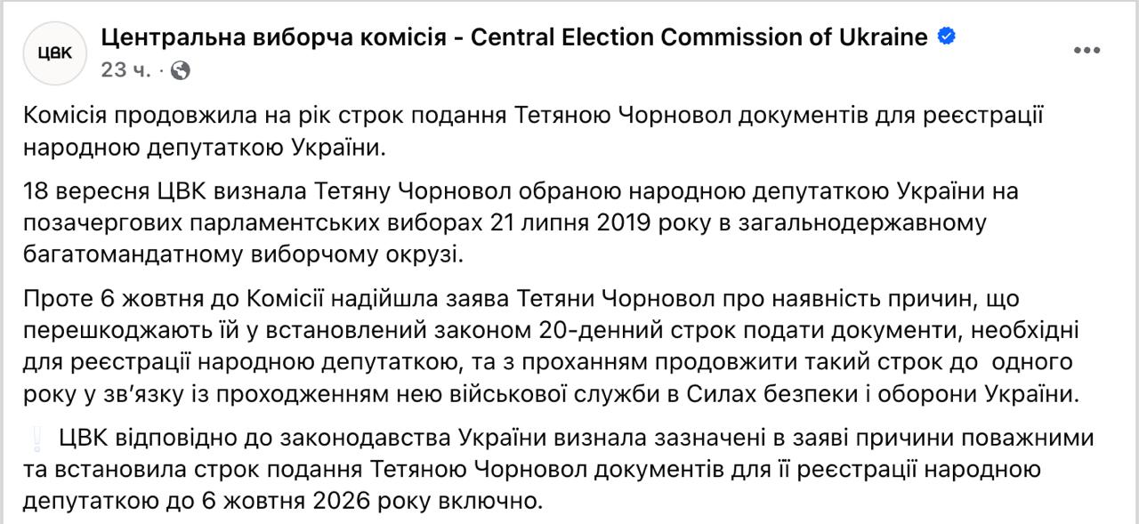 ЦИК подтвердил, что Черновол не отказалась от мандата нардепа, а попросила на год отсрочить подачу документов для регистрации парламентарием.