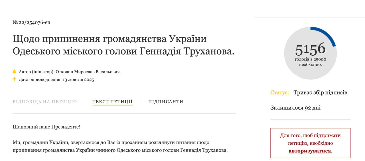 После того, как СМИ сообщили о подготовке на Банковой указа о лишении украинского гражданства мэра Одессы Геннадия Труханова, на сайте Офиса президента появилась петиция с аналогичным предложением.