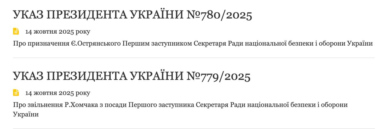 Президент Украины Владимир Зеленский уволил первого заместителя секретаря Совета национальной безопасности и обороны (СНБО) Руслана Хомчака и назначил вместо него генерал-майора Евгения Острянского, который был заместителем начальника Генерального штаба ВСУ.