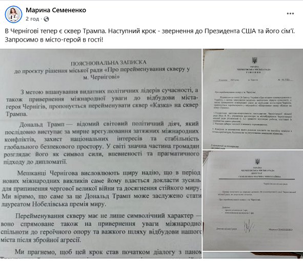 "С целью чествования выдающихся политических лидеров современности, а также привлечения международного внимания к восстановлению города-героя Чернигов предлагается переименовать сквер "Сказка" в сквер Трампа.
