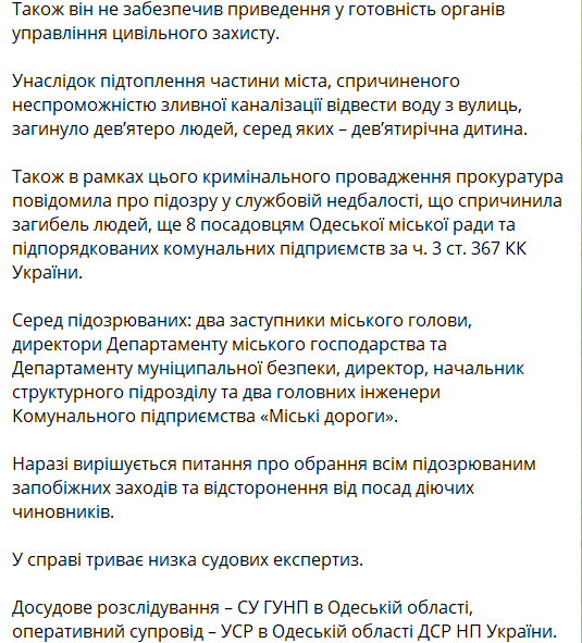 Прокуратура официально подтвердила, что бывший мэр Одессы Геннадий Труханов получил подозрение в служебной халатности, которая привела к гибели девяти человек во время недавнего потопа в городе.
